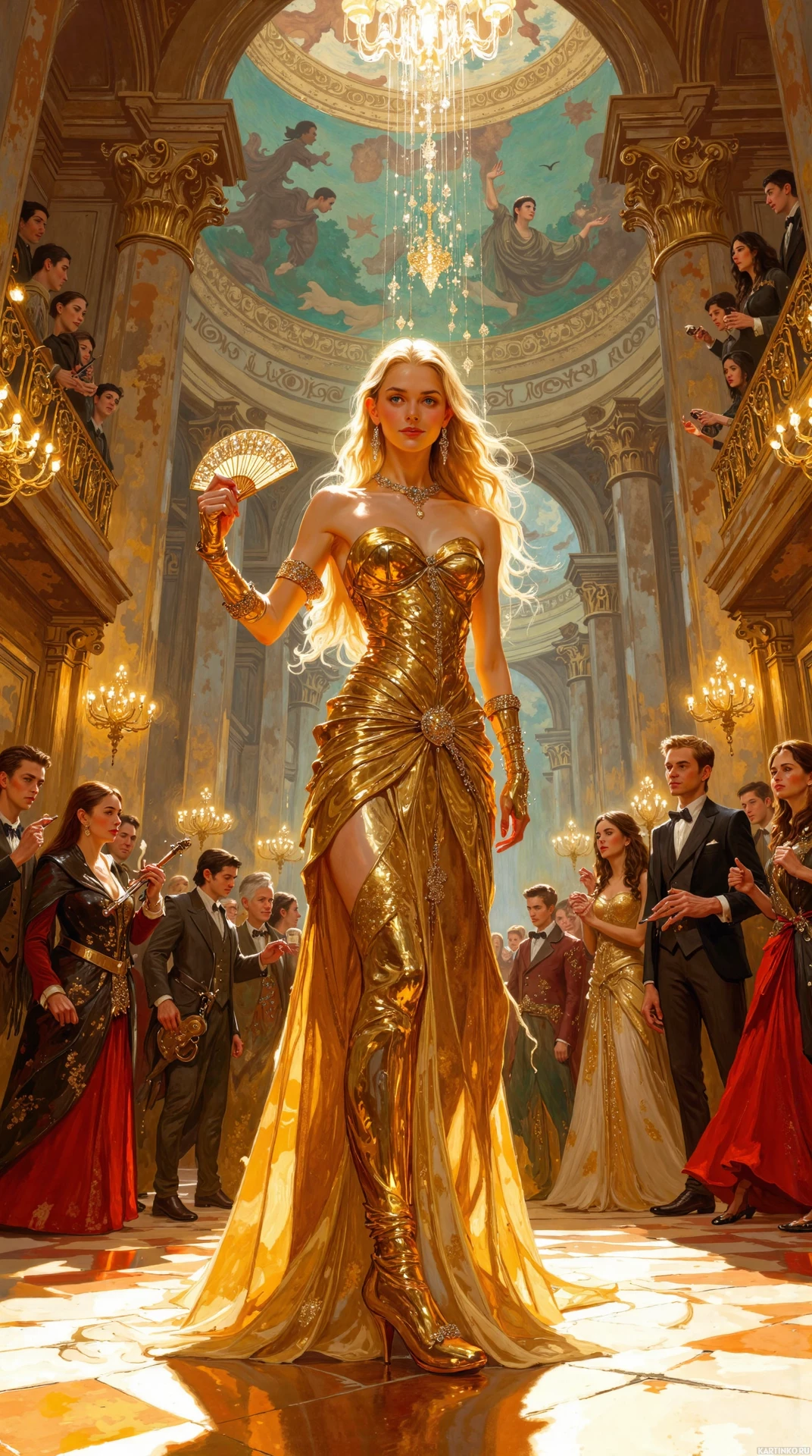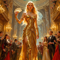 blonde hair wearing an elegant gold dress that appears to be made of silk or satin. The dress is strapless and has