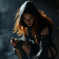 flowing locks cascading over her left shoulder as she gazes intensely into the distance. Her attire consists of a black