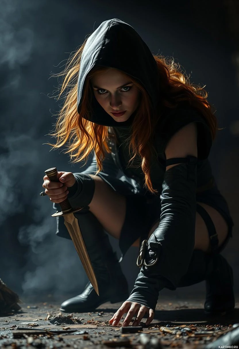 red hair, dressed in an outfit that exudes a sense of mystery and danger. She is crouched down on one knee, her long,