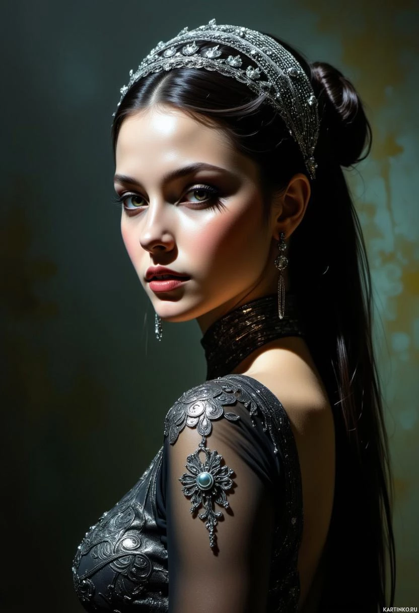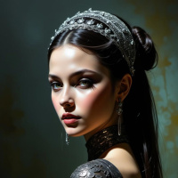 a young woman with long, dark hair styled in a bun and adorned with a silver headband featuring intricate designs. Her face is turned to her left, showcasing her right profile. She wears
