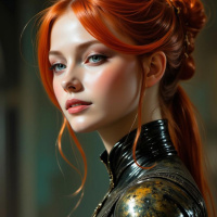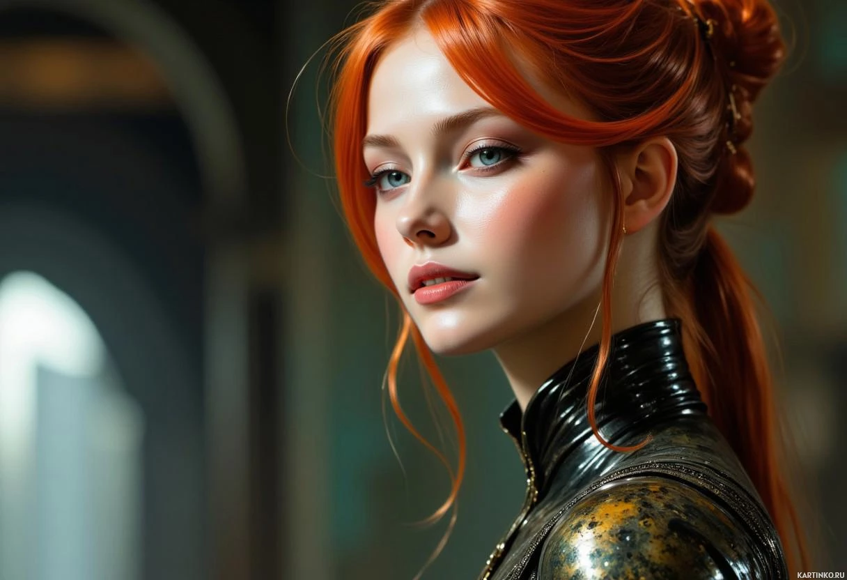 a young woman with striking red hair styled in an elegant updo, complemented by piercing green eyes that seem to sparkle with intelligence. Her fair skin and full lips add to her