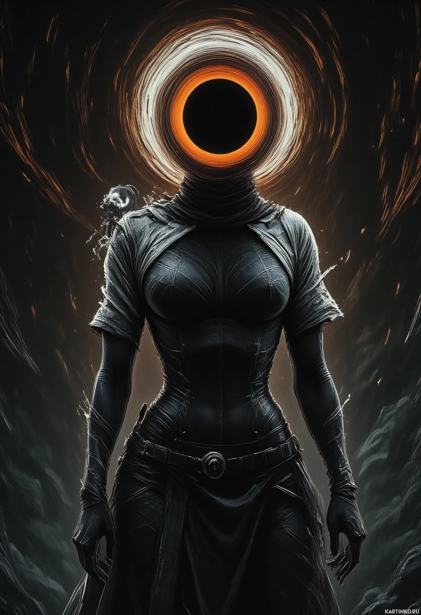 The image depicts a woman with a black hole for a head, standing in front of