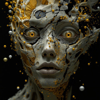 a deep sadness, as if she is trapped in a world beyond our own. Her lips are pursed and slightly downturned, giving the impression that she is holding back tears or struggling to maintain control over her emotions. Despite this, there is something undeniably powerful about her presence in the image. The background of the artwork is dark and muted, with