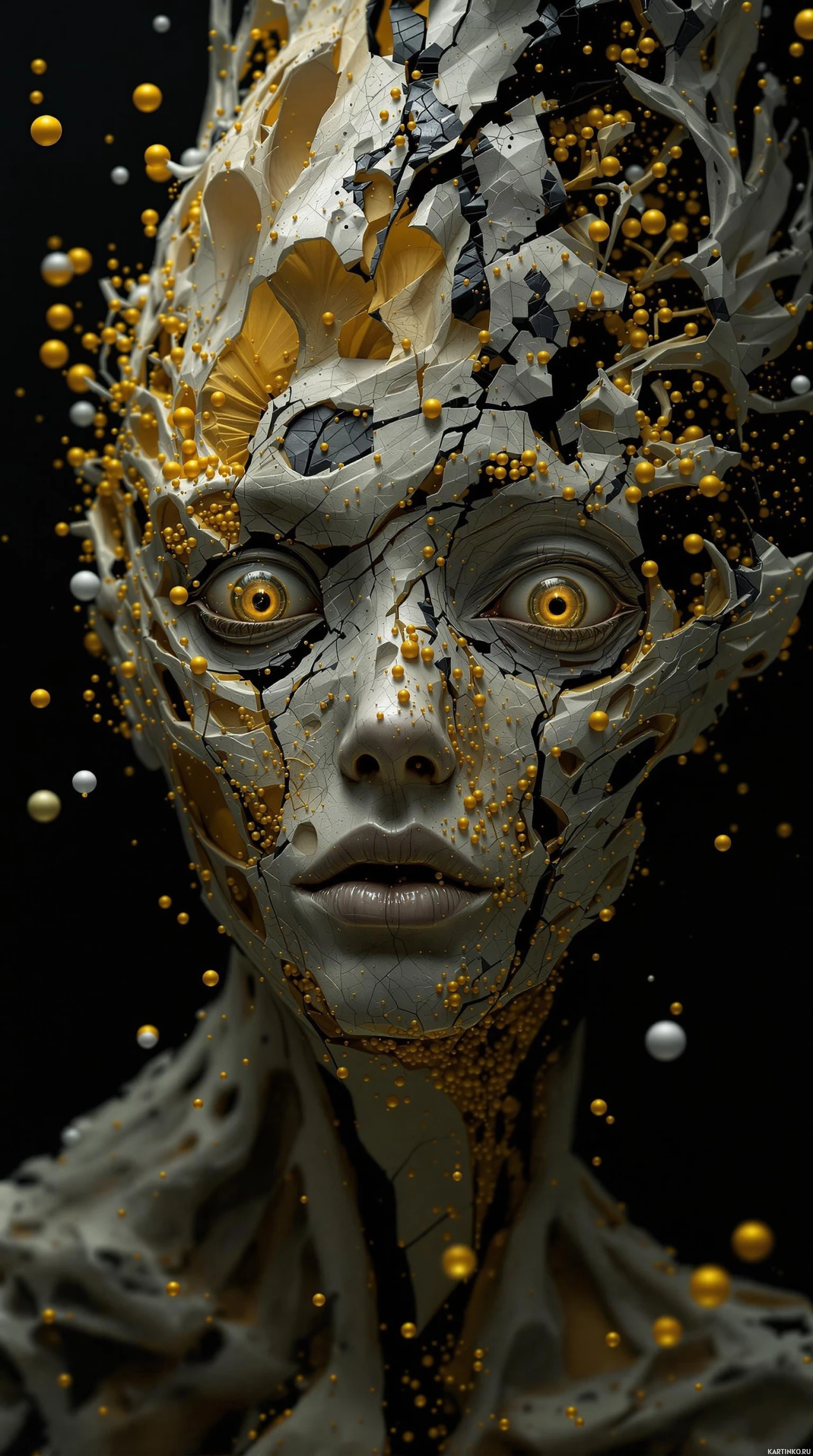 swirling patterns of gold and white, reminiscent of ancient Celtic knotwork or Art Nouveau designs. Her skin appears to be made up of these same patterns, which are also reflected in her hair, where they form a delicate filigree-like texture. The woman's eyes seem to hold