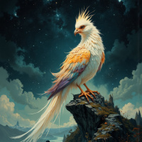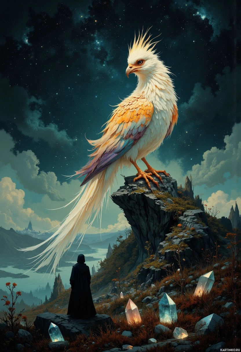 a fantastical scene featuring a majestic white bird with long, flowing feathers and a vibrant plumage of orange, blue, and purple hues perched atop a rocky outcropping. The bird's head is turned to the right, showcasing its striking features. In the foreground, several large crystals are scattered across the ground, emitting