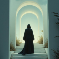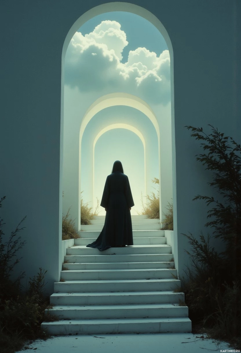 soft lighting adds to the peaceful ambiance of the scene. In terms of symbolism, the archway could represent a transition or threshold between two states of being. The woman's journey up the staircase may symbolize her own personal growth or transformation. Alternatively, the archway could represent a portal to another world or dimension, inviting the viewer to imagine what lies beyond.