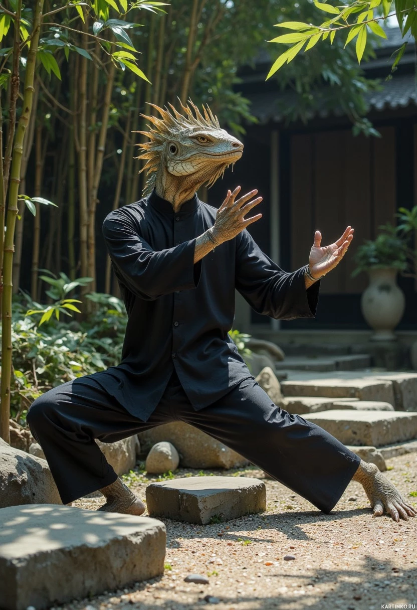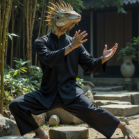 The image depicts a person wearing an iguana mask and practicing martial arts in a serene