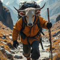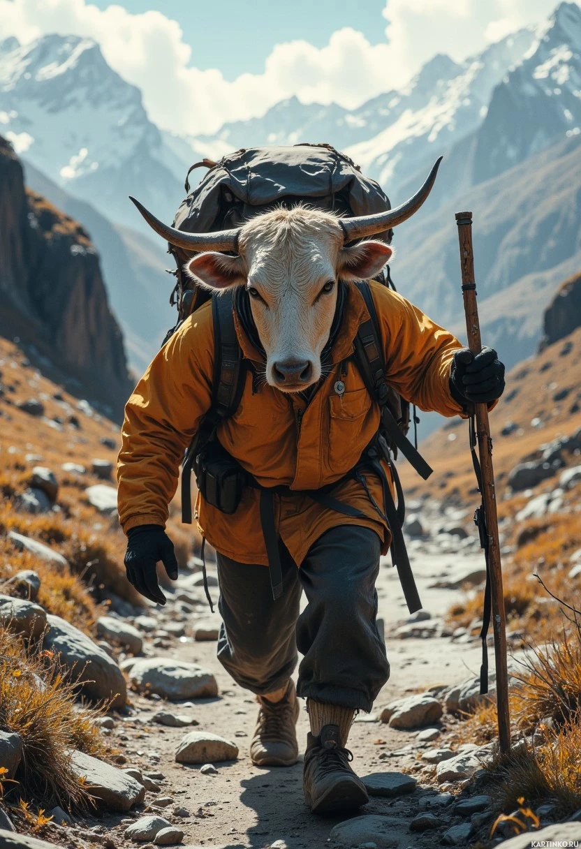 white skin and is holding a walking stick in their right hand. * **Person** * Wearing a yellow jacket * Gray pants * Large backpack on their back * White skin * Holding a walking stick in their right hand * **Background** * Snow-capped mountains in the distance *