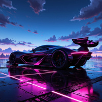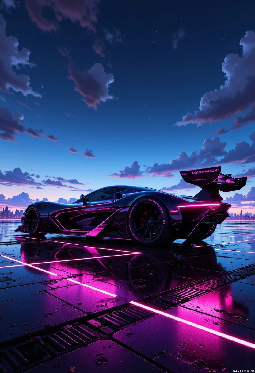 pink accents on the side skirts, rear diffuser, and spoiler. * The car's wheels are black with silver rims and have a distinctive design that suggests they may be custom-made for racing or high-performance driving. * **Background:** * The background of the image is out of focus, but it appears to be a cityscape at dusk or dawn. * There are tall buildings and skyscrapers visible in the distance, as well as a few trees and other vegetation. * The sky is cloudy, with shades of gray and blue visible through the clouds. Overall, the image suggests that the car is parked in an urban setting, possibly after a race or drive. The futuristic design of the car and the cityscape in the background create a sense of high-tech innovation and cutting-edge style.