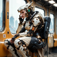 gray color, and the floor is made of polished stone or metal. The overall design suggests a modern, high-tech environment that is both functional and aesthetically pleasing. In terms of composition, the image is well-balanced, with the woman placed centrally in the frame to draw attention to her robotic attire. The use of negative space around her creates a sense of depth and adds visual interest to the overall design. The lighting is soft and even, with subtle shadows accentuating the contours of her body and the robot suit. Overall, the image presents a thought-provoking vision of what it means to be human in an increasingly technological world. It raises questions about the boundaries between flesh and steel, humanity and artificial intelligence, and invites viewers to ponder the implications of such a future for our society as a whole.