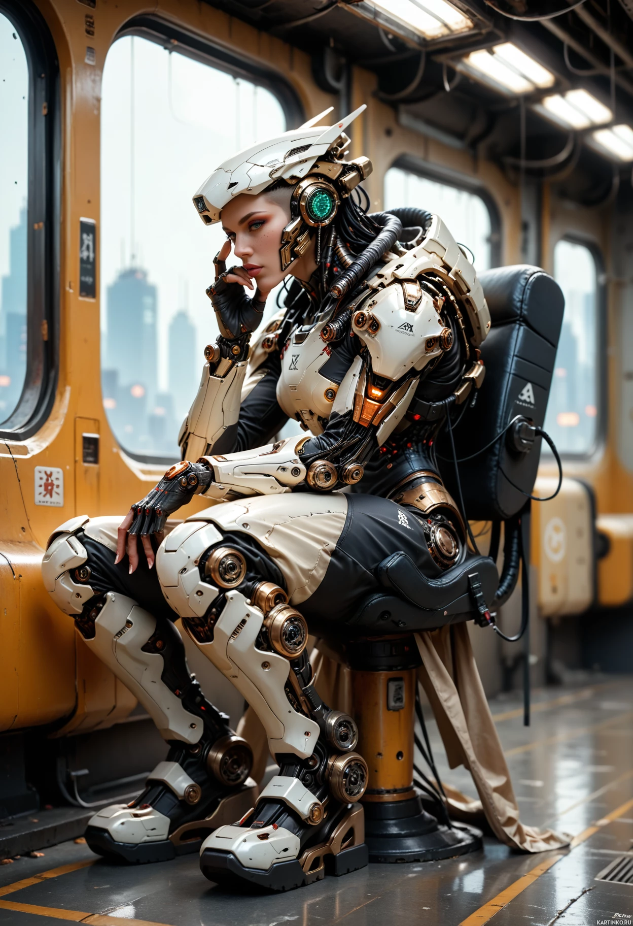 a young woman dressed in a white and black robotic suit, sitting on a chair in a room with large windows. The overall atmosphere suggests a blend of human and artificial intelligence, possibly set in a laboratory or research facility. The woman's attire is a striking combination of organic and synthetic materials, featuring