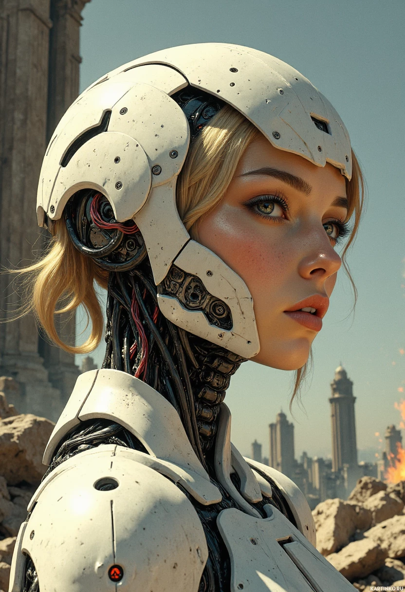 a blonde woman wearing a futuristic helmet, set against a backdrop of a post-apocalyptic cityscape. The woman's long, flowing hair is visible beneath the helmet, which appears to be made of a metallic material with a sleek and