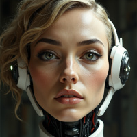a blonde woman with a robotic neck and head, wearing white headphones and a white collar. The woman's face is blurred out, but her eyes are visible, looking straight ahead. Her hair is styled in