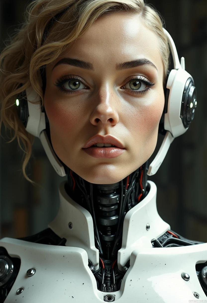 loose waves, framing her face. The robotic neck and head are made of black plastic or metal, with