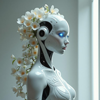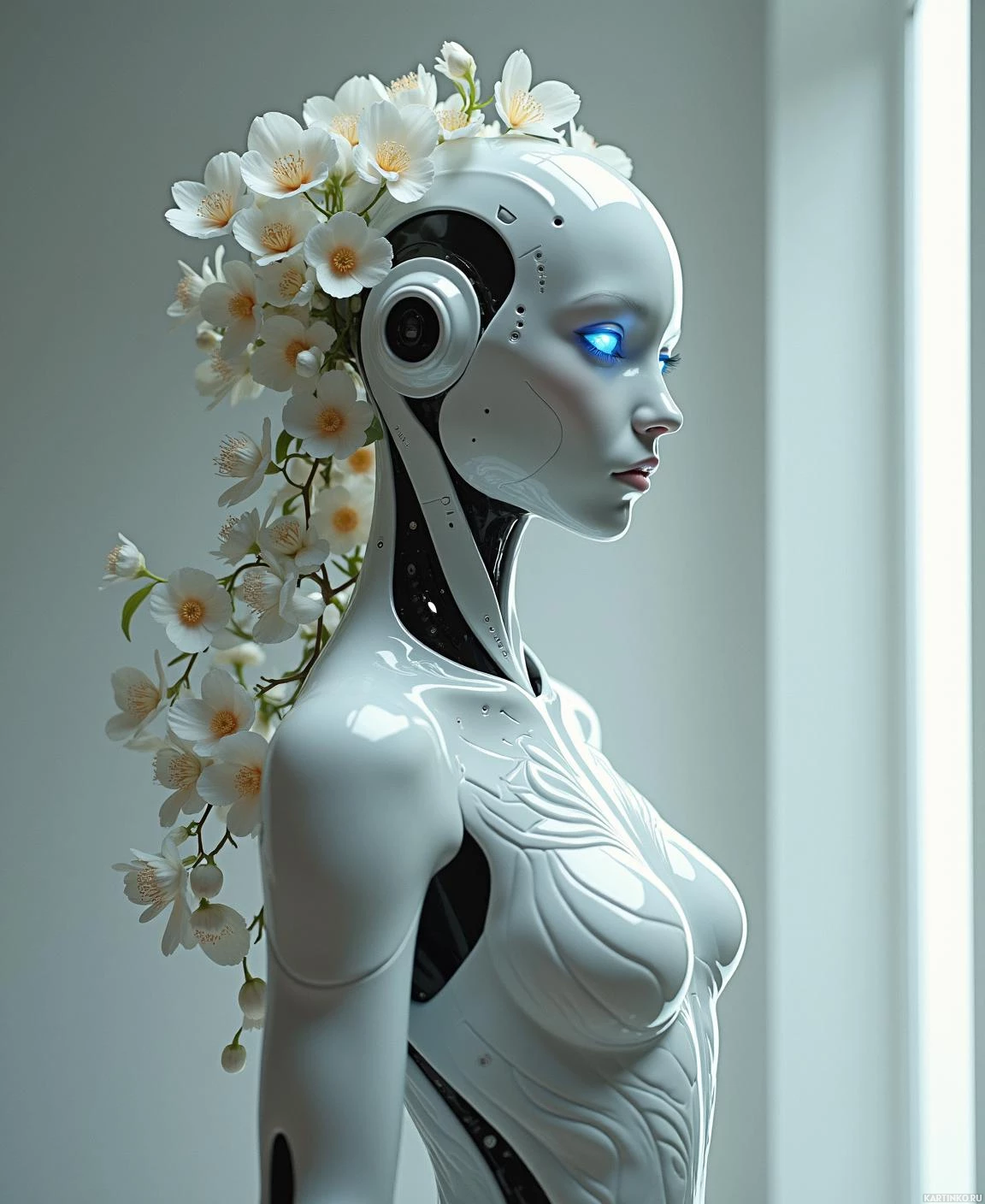 humanoid robot adorned with white flowers in its hair. The robot's sleek, shiny