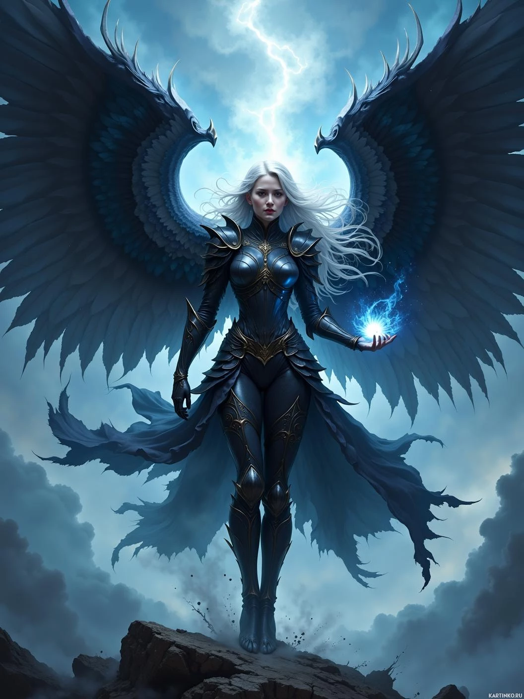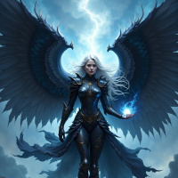 blue orb that crackles with energy. The orb's light illuminates her face, highlighting her determined expression. The image exudes an air of fantasy and adventure, suggesting that this woman may be a powerful sorceress or warrior from a mythical realm. Her wings are spread wide, as if ready to take flight at any moment, and her overall demeanor conveys a sense of strength and authority. The dark clouds and lightning bolts in the background create a dramatic contrast to the woman's radiant appearance, emphasizing her connection to the mystical forces she wields. Overall, the image presents a captivating and enigmatic figure, inviting the viewer to ponder the secrets of her world and the mysteries she embodies.