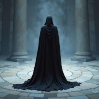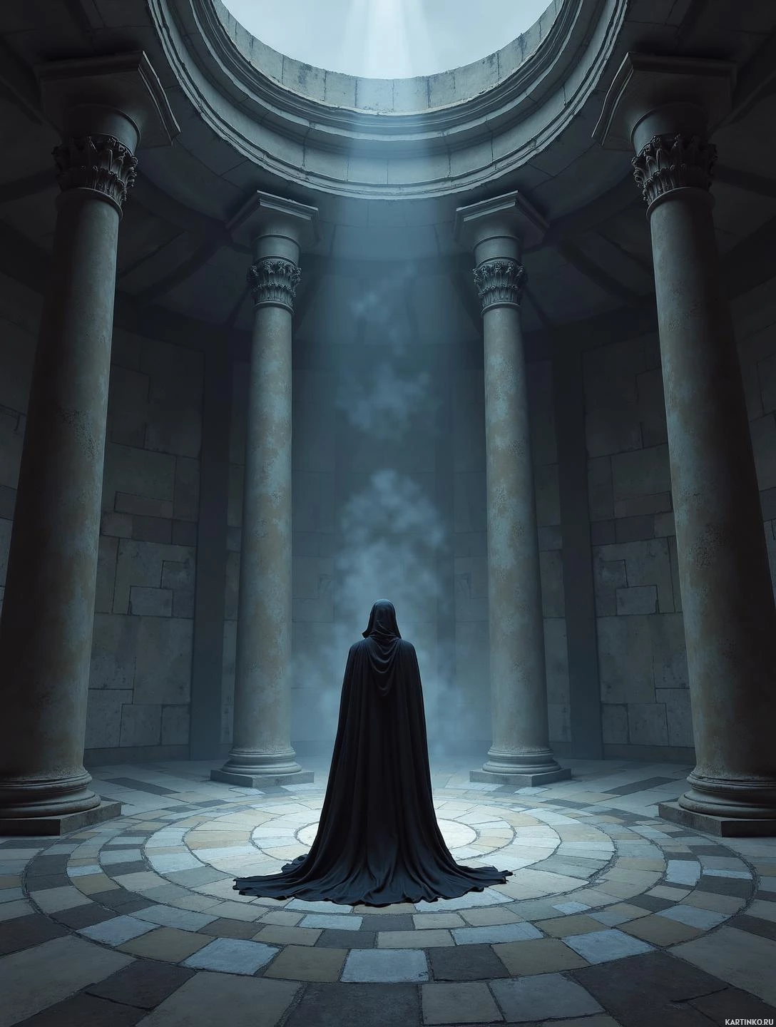 stone structure with columns and arches. The individual is dressed in a long, flowing cloak that covers their head and body, creating