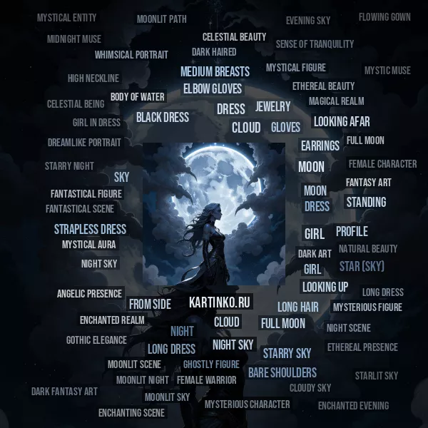a high neckline, while the woman's hair is long and wavy, cascading down her back. In the background, there are clouds surrounding the Moon, which is full and bright. The overall atmosphere of the image suggests that it was taken during nighttime or at dusk, when the sky is dark and the stars are visible. The woman appears to be standing in front of