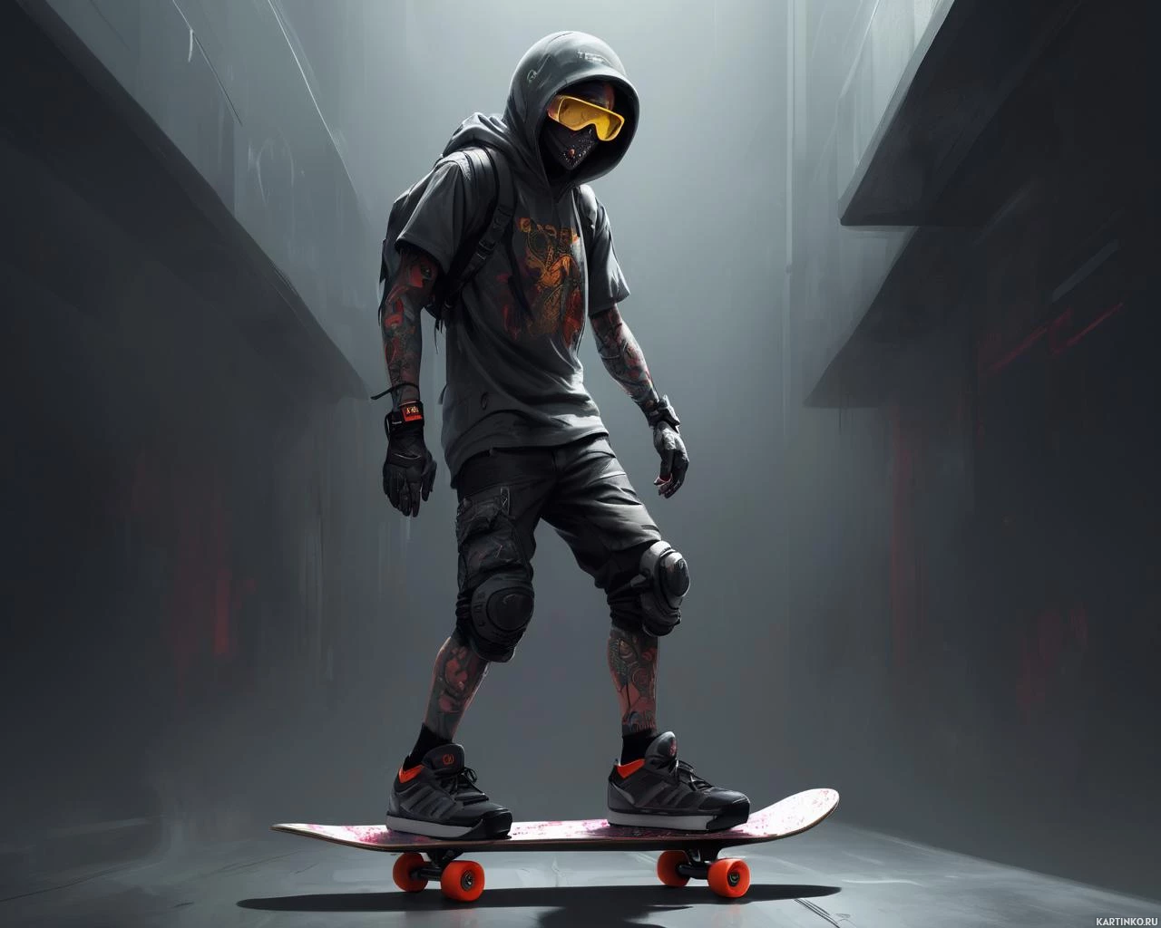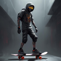 a male figure skateboarding. He is wearing a hood and a backpack, which suggests he might be in motion or about to start moving. On his left arm, there is visible