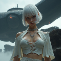 a metallic body and a pointed nose. The aircraft appears to be some kind of spaceship or fighter jet, and it is positioned behind the woman, slightly to her left. The sky above is a deep blue-gray color, suggesting that the scene is set in space or on a distant planet. Overall, the image presents a striking contrast between the futuristic technology represented by the aircraft and the natural beauty of the young woman. The use of white as the dominant color creates a sense of purity and cleanliness, while the metallic sheen of the aircraft adds a touch of sophistication and high-tech appeal.