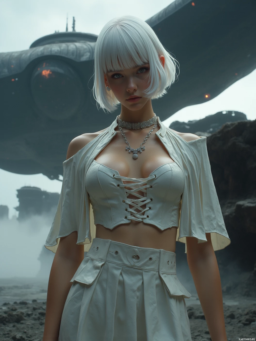 a young woman with white hair, wearing a white outfit and standing in front of a futuristic-looking aircraft. The woman has short, straight
