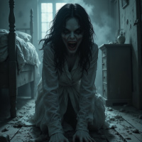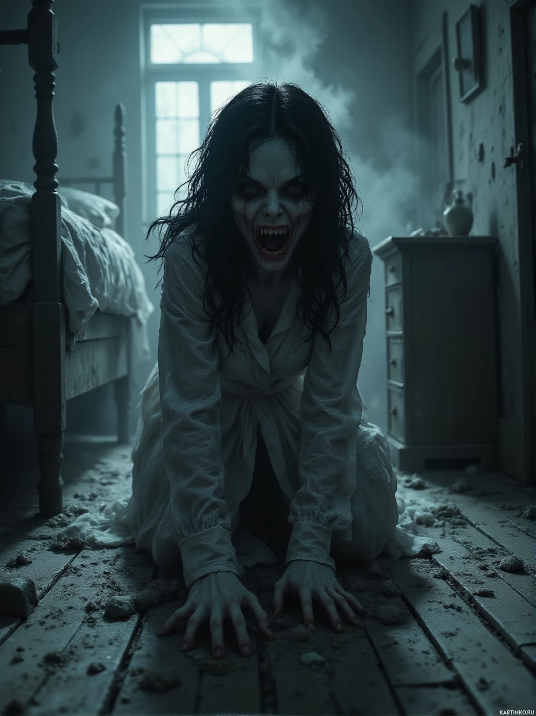 facial expression is one of terror and despair, as if she has just witnessed something unspeakable. The room around her is dimly lit, with cobwebs covering the walls and furniture. The atmosphere is eerie and foreboding, suggesting that something supernatural is present in the scene. The young woman's attire consists of