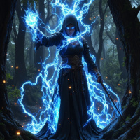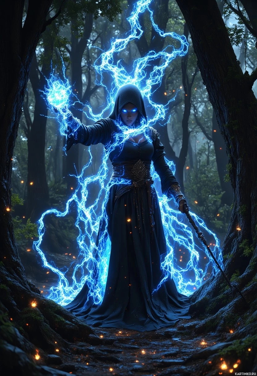 lightning bolts emanating from her body, which are depicted as bright blue lines with orange sparks at their tips. The forest around her is dark and misty, with