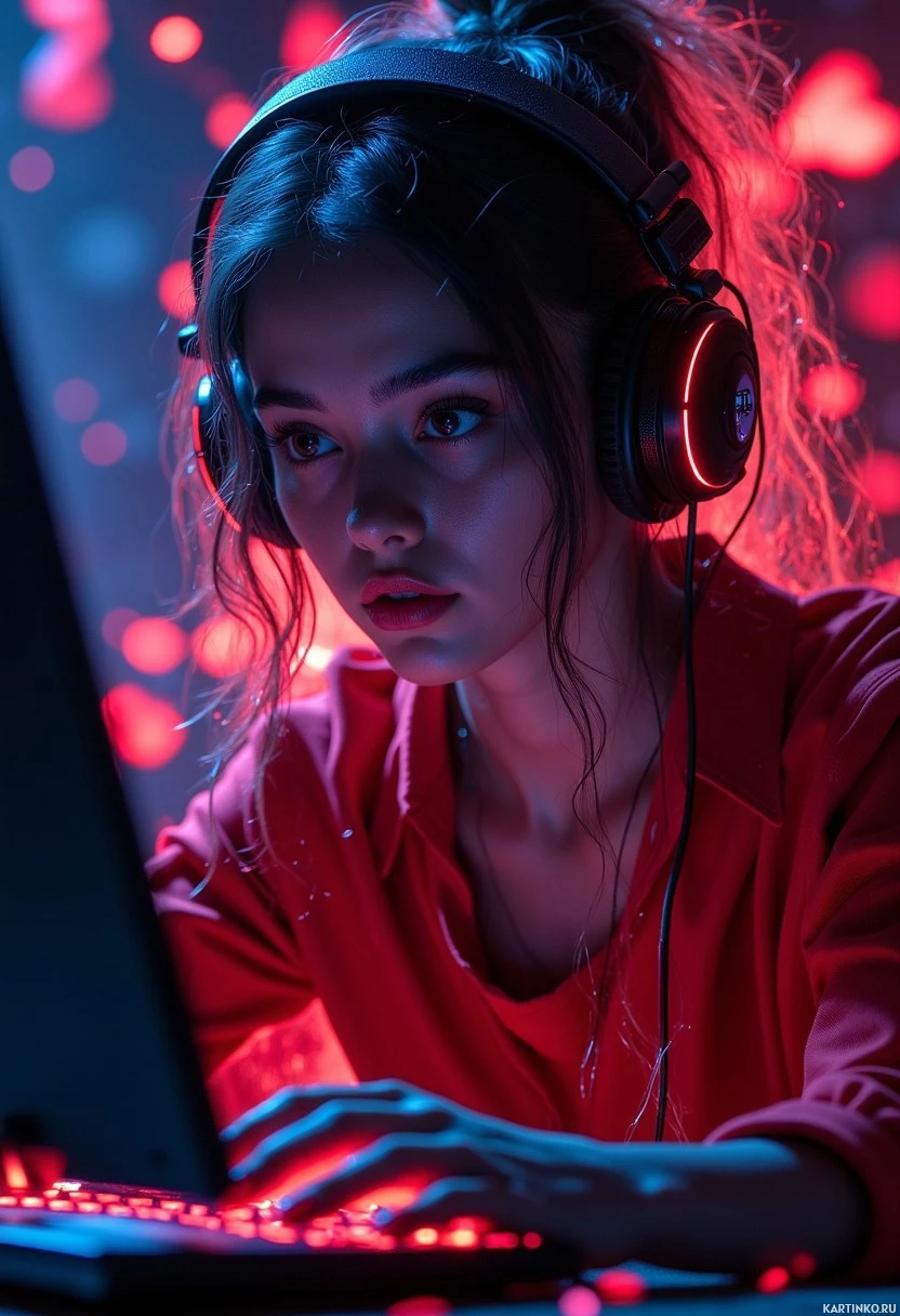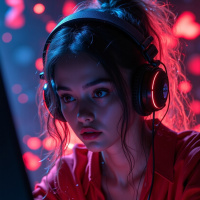 a young woman with long, dark hair tied up in a ponytail, wearing a red shirt and large black headphones with glowing red accents. She is intently focused on