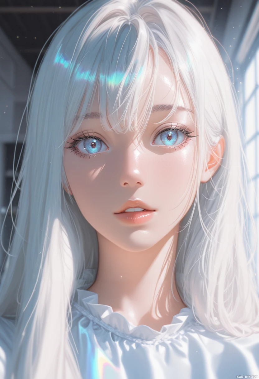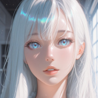 a young woman with striking white hair and piercing blue eyes. Her long, straight locks cascade down her back, framing her heart-