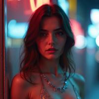 facial expression is neutral, with a hint of confidence. In the background, the neon lights cast a colorful glow on the glass wall, creating