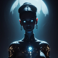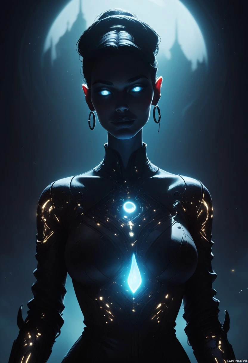 an inner light. Her lips are thin and pressed together, giving her a determined expression. She stands confidently, shoulders back, with a sense of purpose in her stance. In the background, there is a subtle gradient that suggests a futuristic or sci-fi environment. The overall effect is one of high-tech sophistication combined with an air of mystery and intrigue.