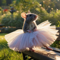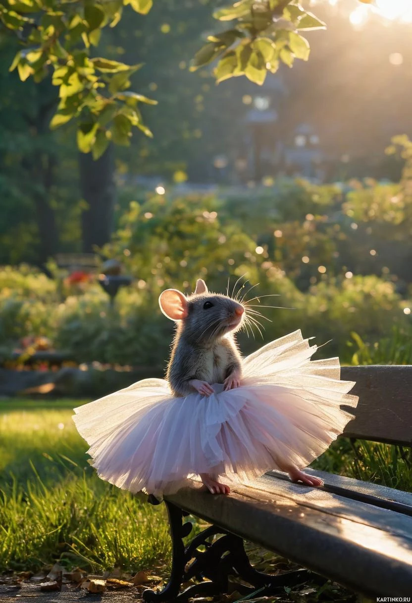 a whimsical scene featuring a rat donning a tutu, standing on its hind legs atop a park bench. The rat's attire consists of a light
