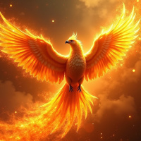 fiery hues, its feathers glowing like embers as it soars through the air. Its wings are outstretched, and its