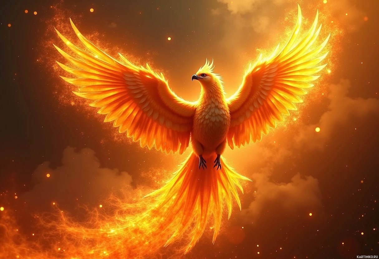 a fantastical bird, reminiscent of the mythical phoenix, in mid-flight. The bird's plumage is ablaze with