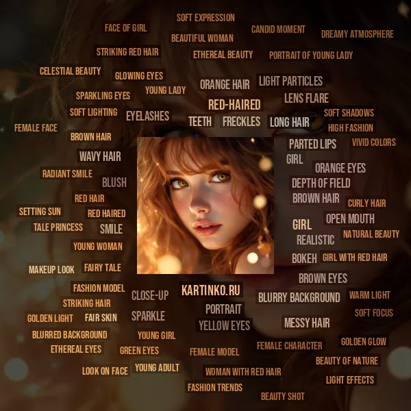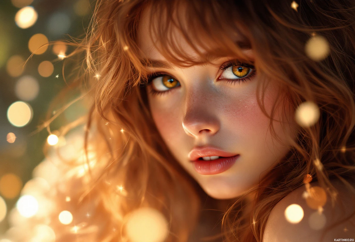 fair skin is illuminated by the warm light of the setting sun, which casts a golden glow over her face. The wind blows through her hair, causing it to ripple and flow in the breeze. In the background, the sky is painted with hues of pink and orange, while the trees are bathed in