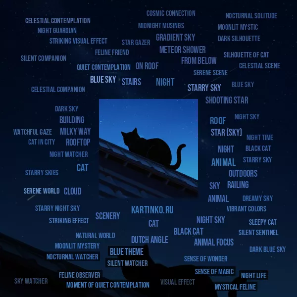 The image depicts a serene scene of a black cat sitting on a roof, gazing up at