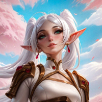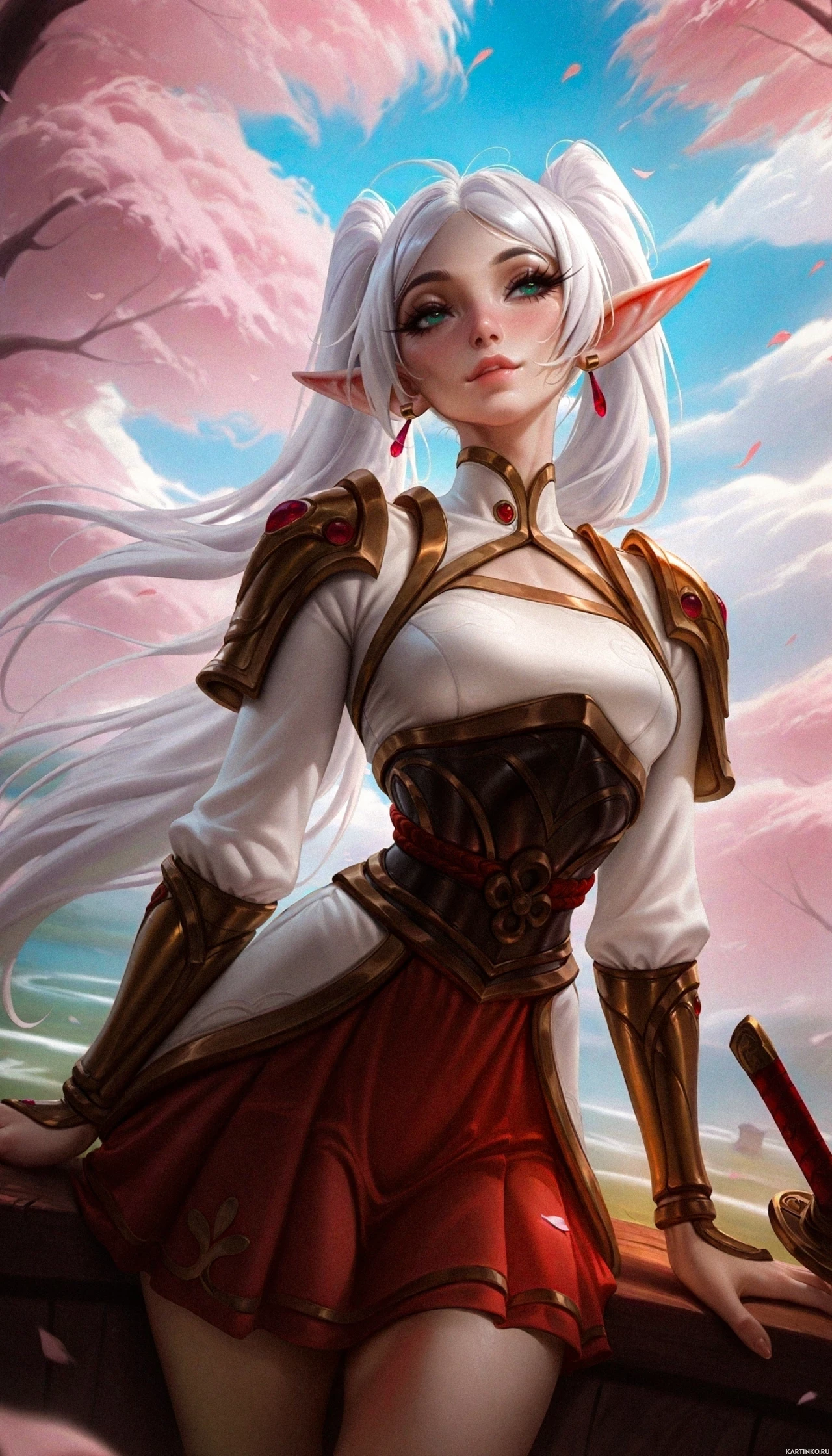 loose waves, framing her face and accentuating her slender neck. The elf's eyes are cast downward, adding to the enigmatic quality of her expression. In the background, pink trees and a blue sky create