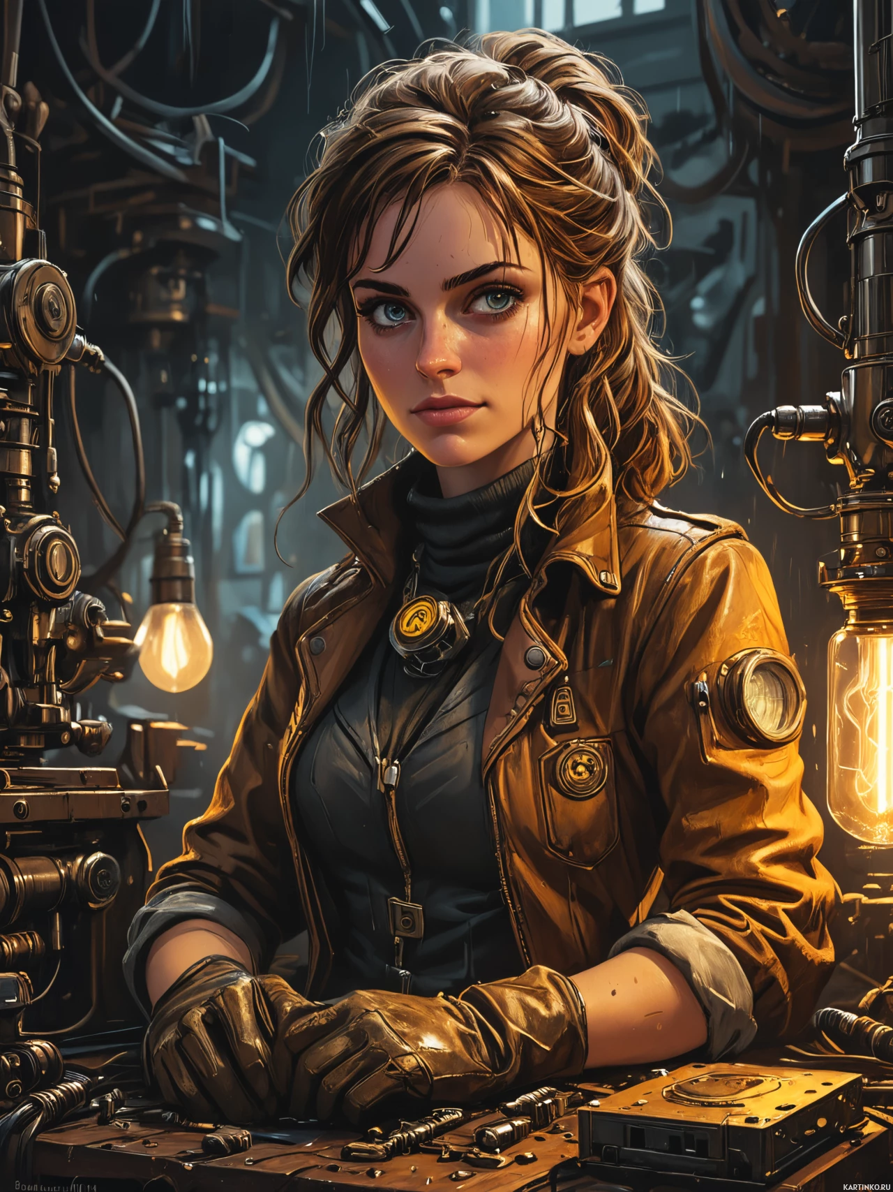 blue eyes, dressed in a brown leather jacket, black turtleneck sweater, and brown gloves. She is seated at a workbench, surrounded by