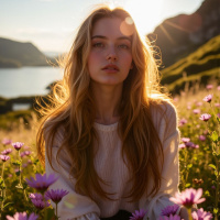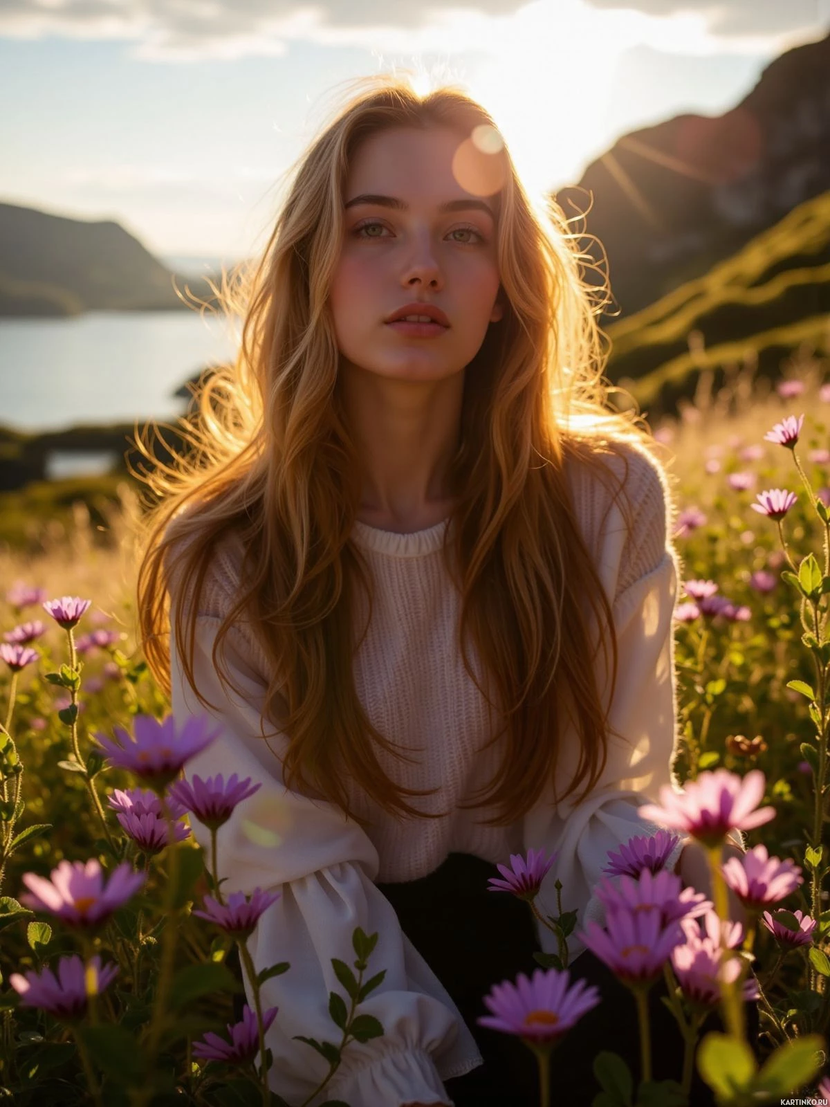 a young woman with long, wavy blonde hair and fair skin sitting in a field of purple flowers. She is wearing a white sweater and