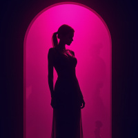 a long dress that appears to be made of a flowing material such as silk or chiffon, and her hair is styled in a ponytail. The background of the image is a bright pink color, which suggests that the scene may be taking place at night or in a dimly