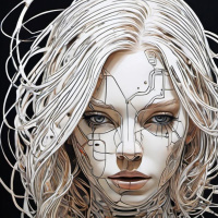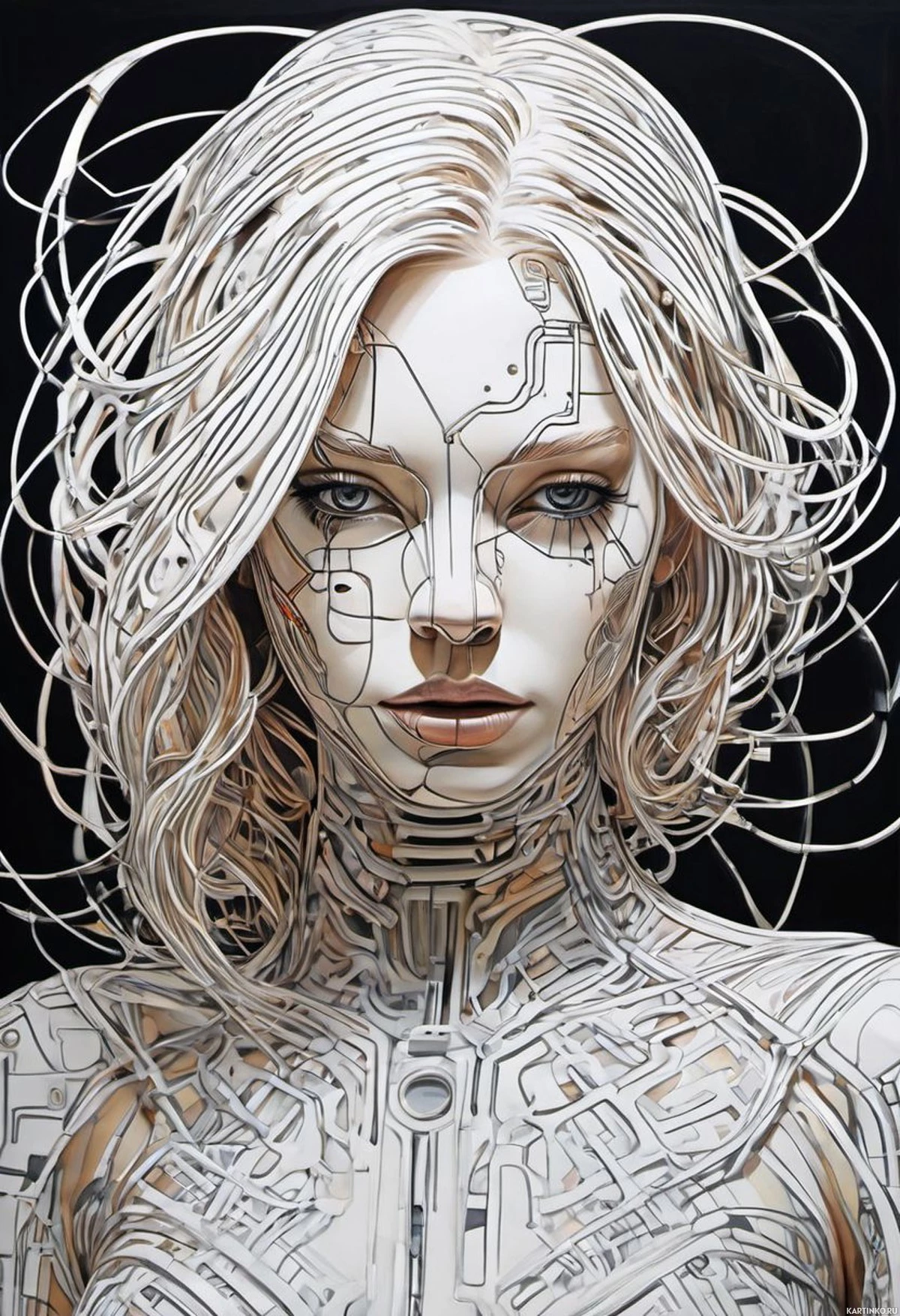 white hair and is adorned with silver or metallic elements that give her appearance a futuristic or science fiction aesthetic. Her