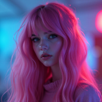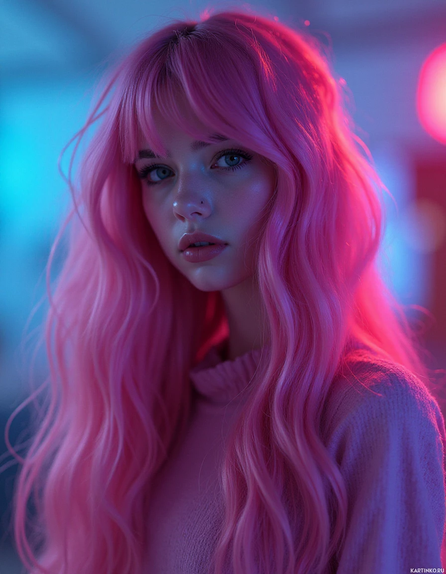 a young woman with striking pink hair, which appears to be dyed or styled in a way that accentuates its vibrant color. Her long, wavy locks cascade down her back, framing her face and adding