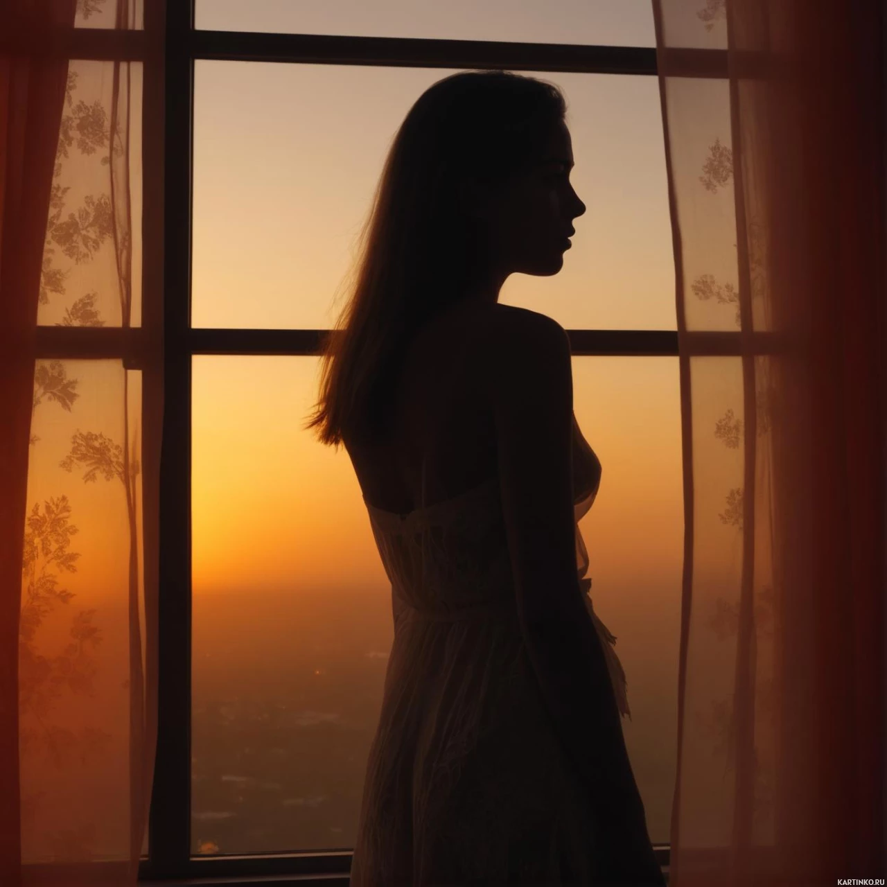 a serene scene featuring a woman standing in front of a window, her silhouette illuminated by the warm glow of the setting sun. In the foreground, the woman is positioned centrally, with her body angled slightly towards the right side of the frame. Her