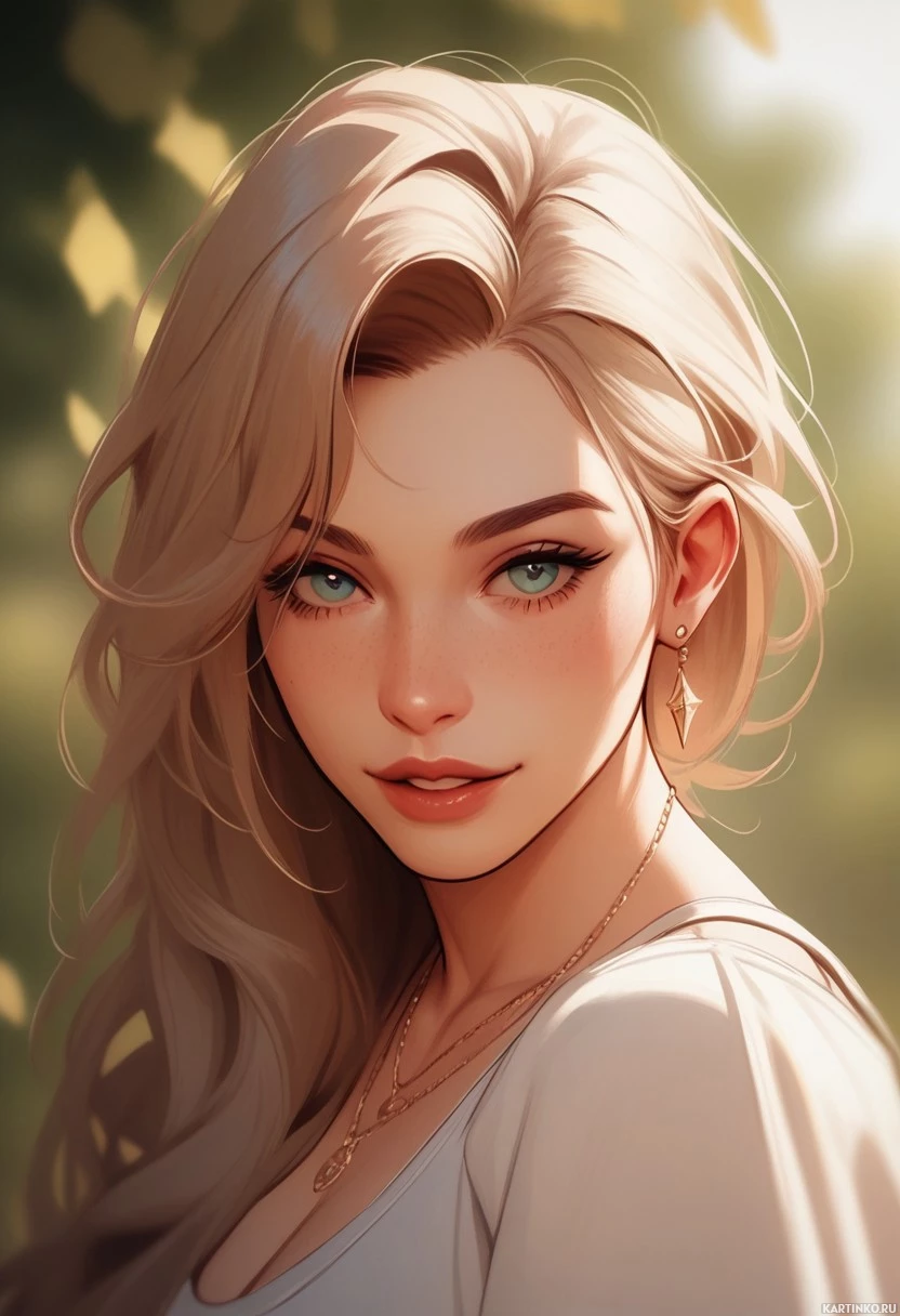 a subtle smile playing on her lips, giving her an air of confidence and poise. * Her eyes are bright blue, with thick eyelashes that add to their allure. * The woman's skin tone is fair, with a smooth complexion that suggests she takes good care of herself. Overall, the image presents a serene and elegant portrait of a young woman, exuding a sense of calmness and sophistication.