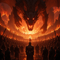 clouds of smoke and ash rising from the ground. The overall atmosphere of the scene is one of tension and conflict, as the dragon and warriors prepare to clash in battle.
