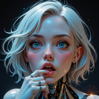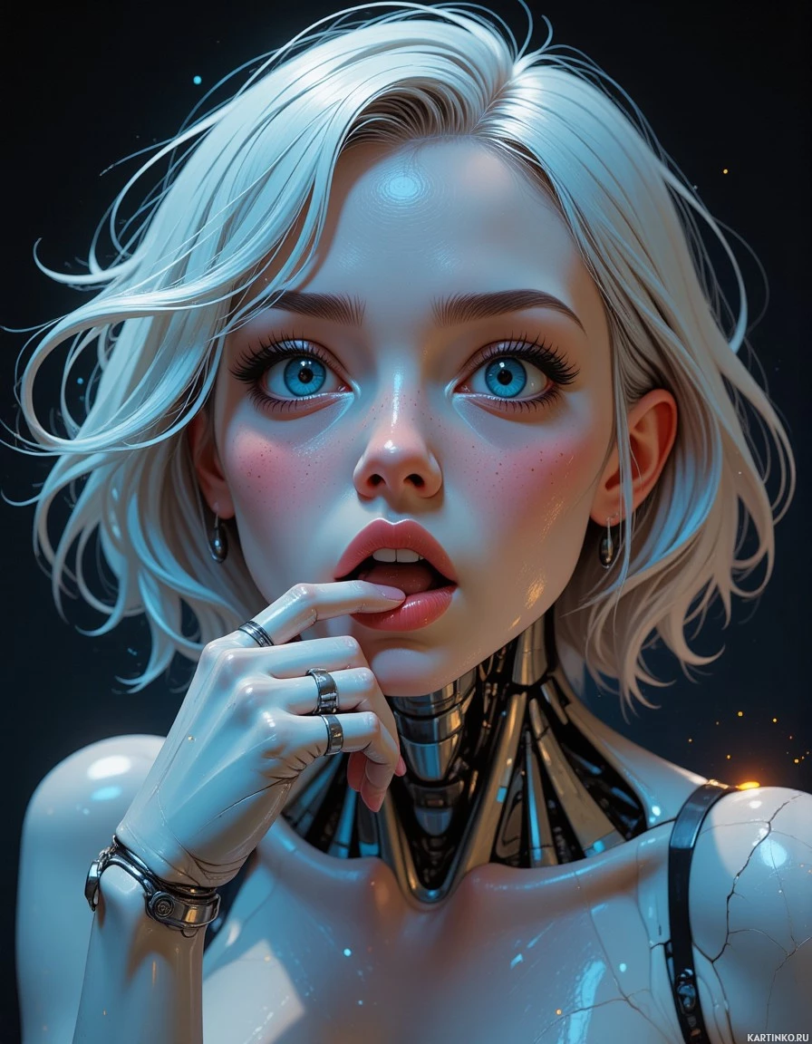На картинке запечатлена молодая женщина с белыми волосами, похожая на персонажа из научно-фантастического фильма. У нее поразительно голубые глаза, а на пальцах – металлические украшения. На ней обтягивающий серебристый комбинезон, закрывающий всё тело, за исключением лица и шеи, где он расходится тонкими полосками. В целом, образ создает впечатление футуристической или киберпанк эстетики.