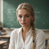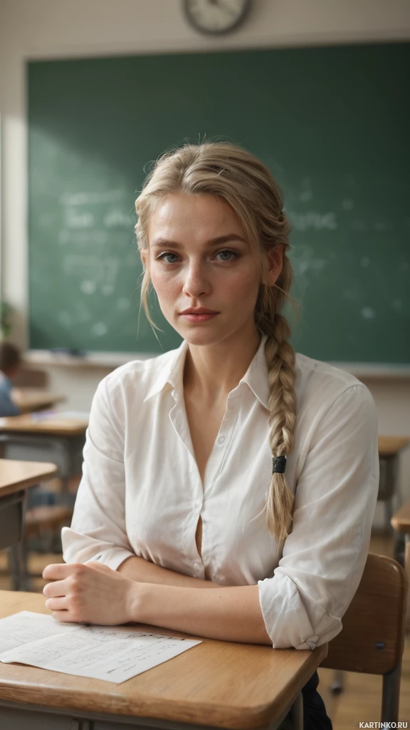 a classroom setting, complete with desks, chairs, and a chalkboard on which some illegible writing can be seen. The overall atmosphere is one of quiet contemplation, as if the woman is lost in thought while sitting at her desk. Upon closer inspection, it becomes apparent that the woman is surrounded by various objects, including papers, pens, and pencils scattered across her desk. These items suggest that she may be engaged in some form of academic or creative activity, but their specific purpose remains unclear. Despite the somewhat ambiguous nature of the image, one thing is certain: the young woman exudes an air of intelligence and sophistication, as if she is well-versed in the subject matter at hand. Her posture and expression convey a sense of authority and confidence, making it difficult to imagine her as anything other than a capable and knowledgeable individual. In summary, the image presents a captivating portrait of a young woman who appears to be deeply engaged in some form of intellectual pursuit. While the exact nature of her activity remains unknown, her demeanor and surroundings suggest that she is a highly skilled and accomplished individual.