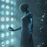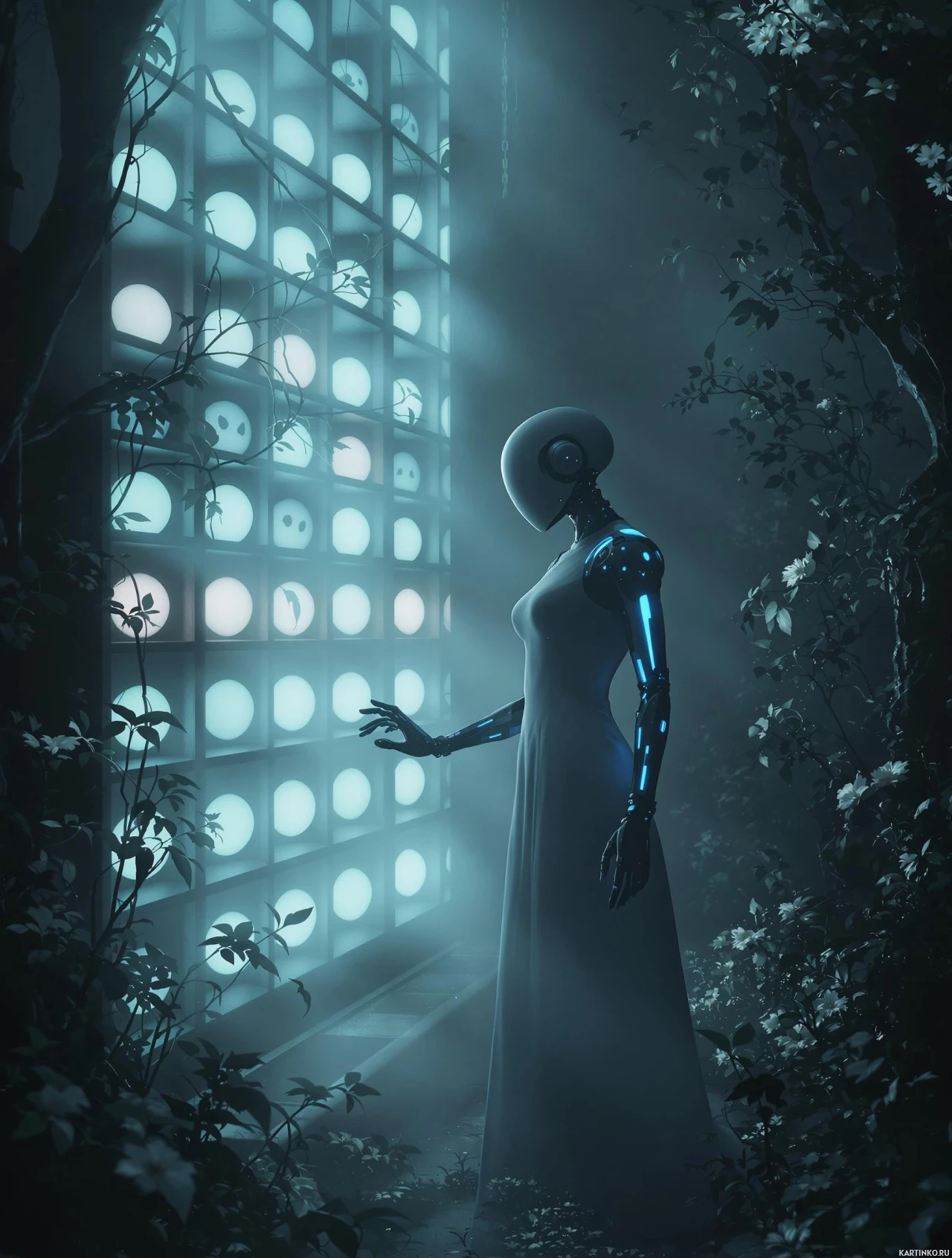 the surrounding environment and casting an ethereal ambiance. The overall atmosphere of the image is one of serenity and contemplation, as if the robot is lost in thought or meditating.