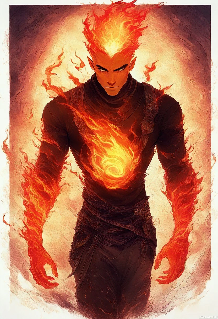 the vibrant orange and yellow flames that surround him, which seem to be an integral part of his being. The flames are depicted as swirling tendrils of fire that dance around his body, creating a sense of
