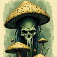 a striking composition featuring a skull at its center, surrounded by an assortment of mushrooms. The skull is rendered in a light
